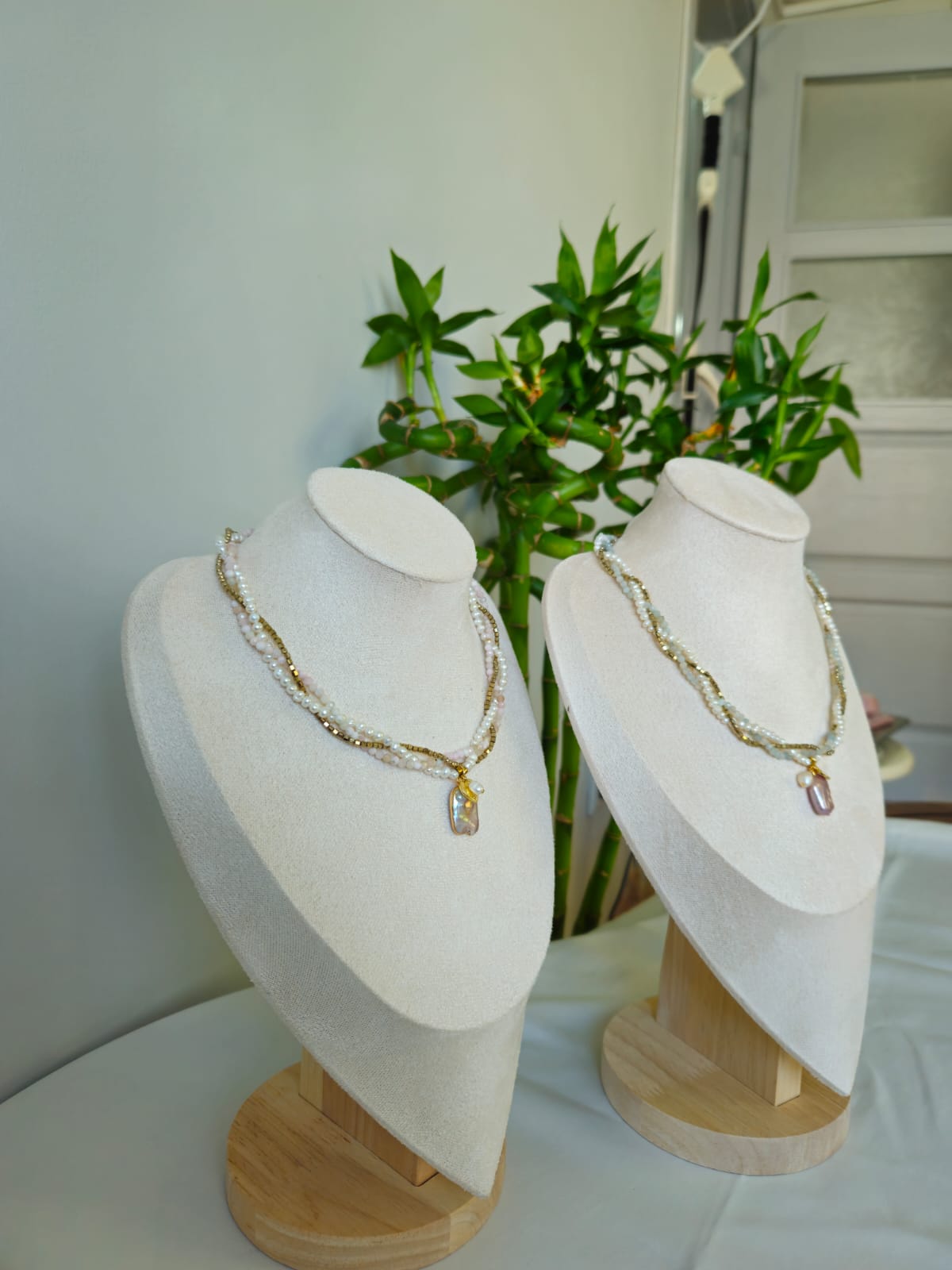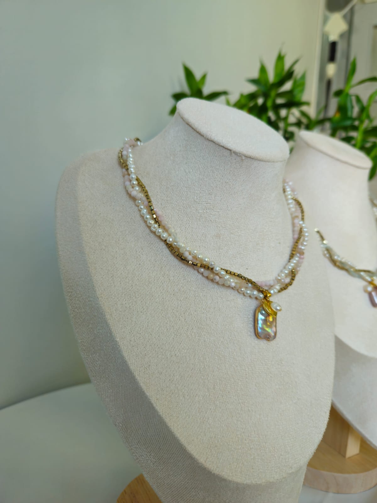 - Kolyemiz, Doğal 3mm Pembe Kuvars taşı, 3-4 mm Doğal Kültür incisi ve Hematit taşları ile kombin edilmiş benzersiz bir tasarımdır.