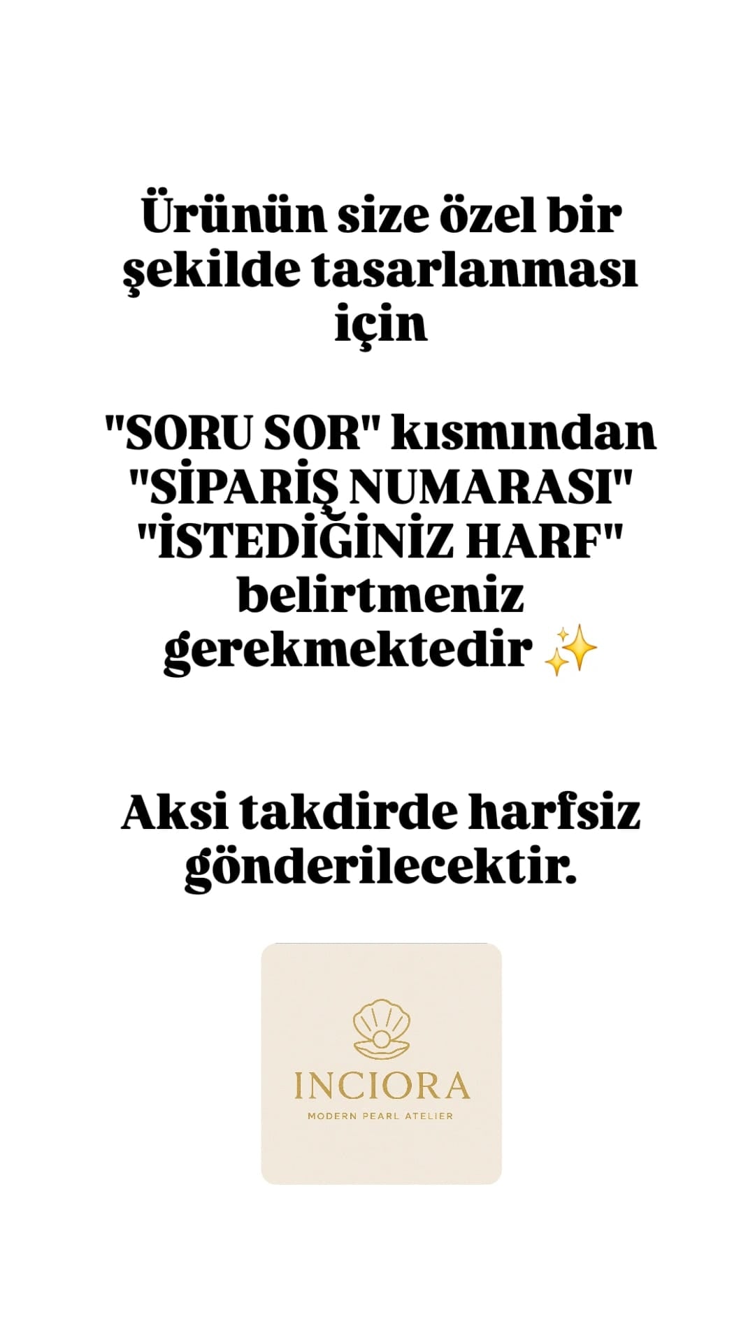 -Ürün talimatlarına "İstediğiniz Harf" i ve "Kolye Uzunluğunu" belirtiniz. Aksi takdirde Harfsiz gönderilecektir - Harf dışında farklı charm seçeneklerini seçebilirsiniz bu durumda Harf seçimi yapmayınız.