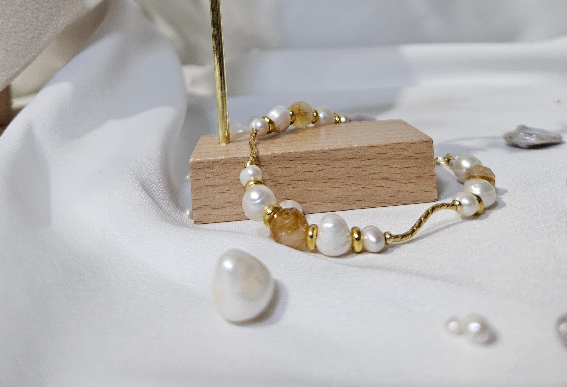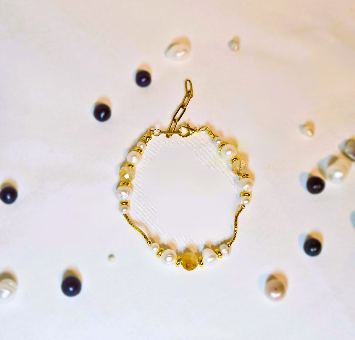 - Altın rengiyle klasik ve zamansız bir görünüm sunar, her türlü kıyafetle kolayca uyum sağlar.; - El işçiliği ile üretilmiş olması, her bilekliğin benzersiz ve özel olduğunu gösterir.; - Bu inci bileklik, kişisel tarzınıza ekstra bir dokunuş katmak için idealdir.; - %100 gerçek ve premium kalitede inci ve en kaliteli sitrin taşları ile oluşan materyali sayesinde zarif ve çarpıcı bir görünüm sunar.; - İnci taşıyla süslenmiş bu altın renkli bileklik, şıklığınızı tamamlamanız için mükemmel bir seçenektir.